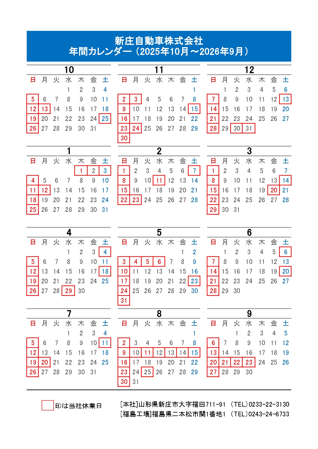 新庄自動車の2025年10月から2026年9月の営業日カレンダーです。 日・祝以外に、不定期に土曜日も休日となりますので、修理でお越しになる際にはご注意ください。修理のご相談は、当社の公式LINEへメッセージいただくことで事前相談・日程調整を行うことが出来ますので是非ご利用ください。 また、財布やスマホケースに収納可能なカードサイズの営業日カレンダーを数量限定で配布しております。ご入用のお客様はLINEメッセージにてご連絡いただくか、修理等でご来店の際にスタッフにお声がけください。