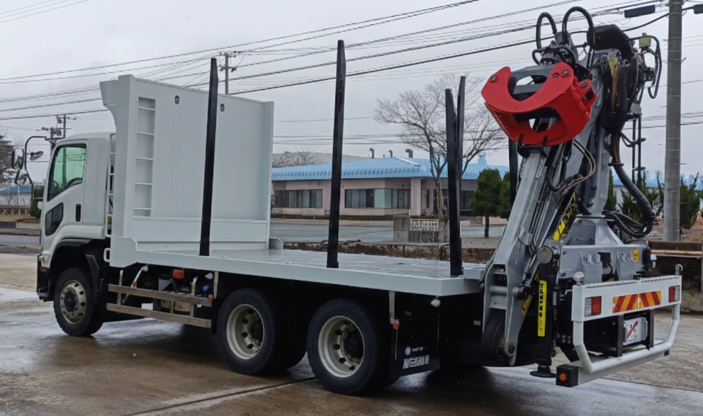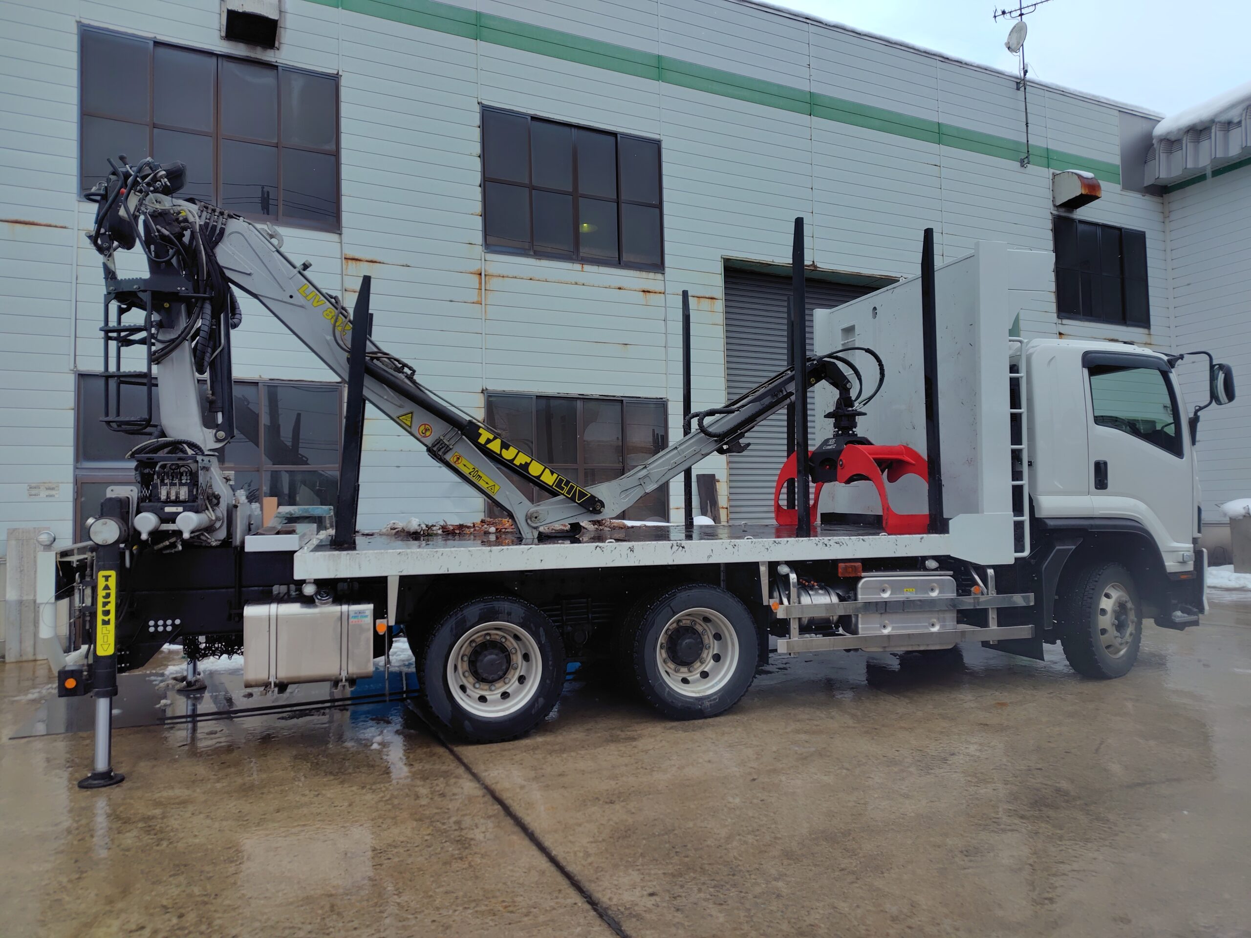 東北の森林組合様へ、L80Z(73)クレーンを搭載したいすゞFVZベースの原木運搬車を納車いたしました。
